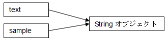 In this example, the String object can be referenced by the name of text or sample . Both point to the same instance in the String object reference. therefore,