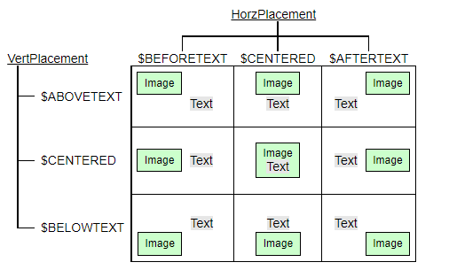 The relationship between the set image and the characters specified in the Value. property is as follows by specifying the VertPlacement and HorzPlacement properties.