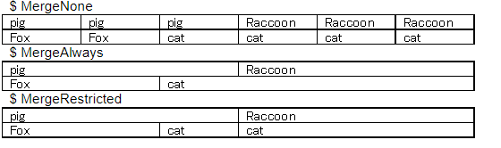| $MergeAlways | 1 | Always merge Whenever cells with the same content are consecutive, they are merged. |